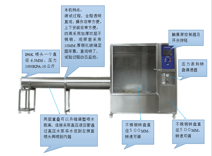 本淋雨試驗室設備,由淋雨試驗室外殼維護室體、噴淋裝置、水處理系統、循環水泵送系統、控制系統及安全防護系統等組成。